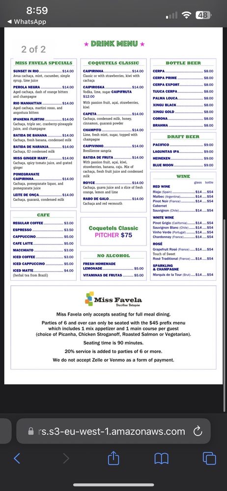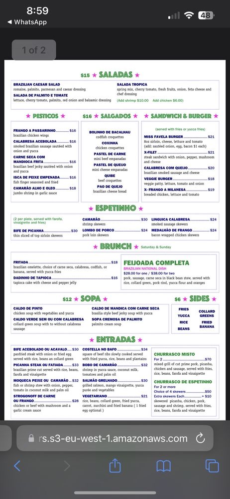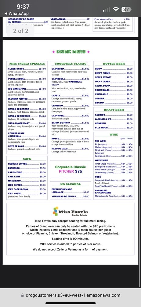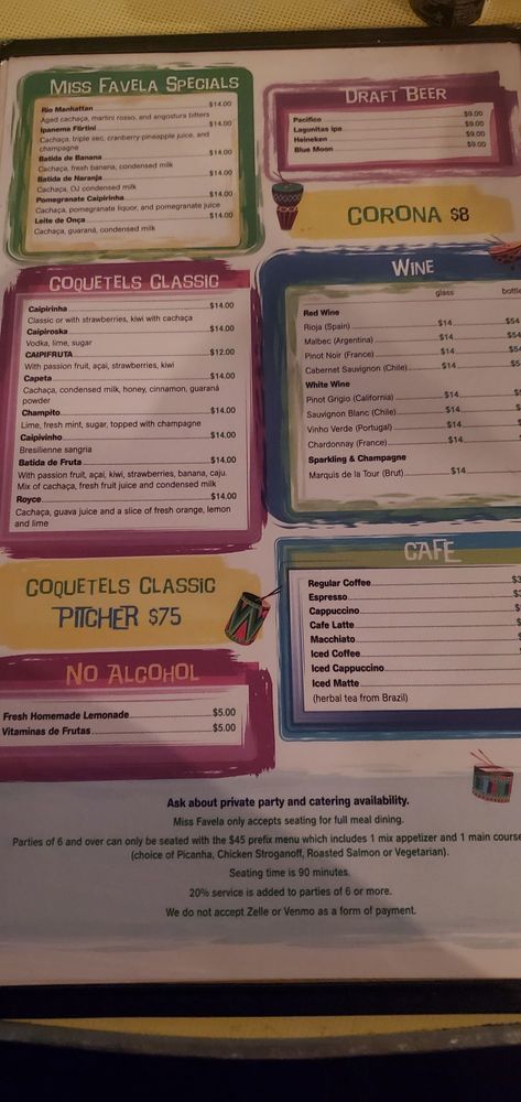 Miss Favela is a vibrant Brazilian diner in Brooklyn, NY, offering a unique blend of traditional dishes with a modern twist. The brunch menu features the Feijoada Completa, a hearty Brazilian national dish, and creative omelette options like Fritada com Banana. Their Sopa selection includes flavorful choices like Caldo de Pinto and Caldo Verde com Calabresa. The Saladas range from a refreshing Brazilian Caesar Salad to the flavorful Salada de Bacalhau. Customers rave about the lively atmosphere, great music, and delicious food, with standout dishes like the shrimp and beef. Overall, Miss Favela offers a dynamic dining experience filled with Brazilian flavors and exciting vibes that are perfect for a fun night out.